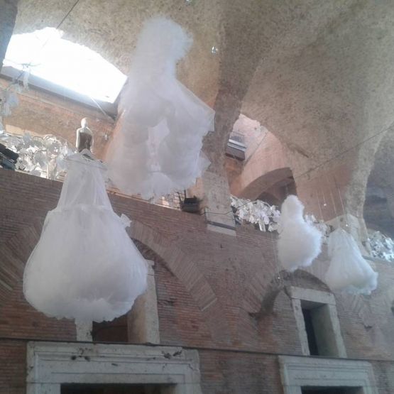 Siamo accolti da nuvole bianche che cadono dal soffitto. Sono gli abiti di Italo Marseglia.